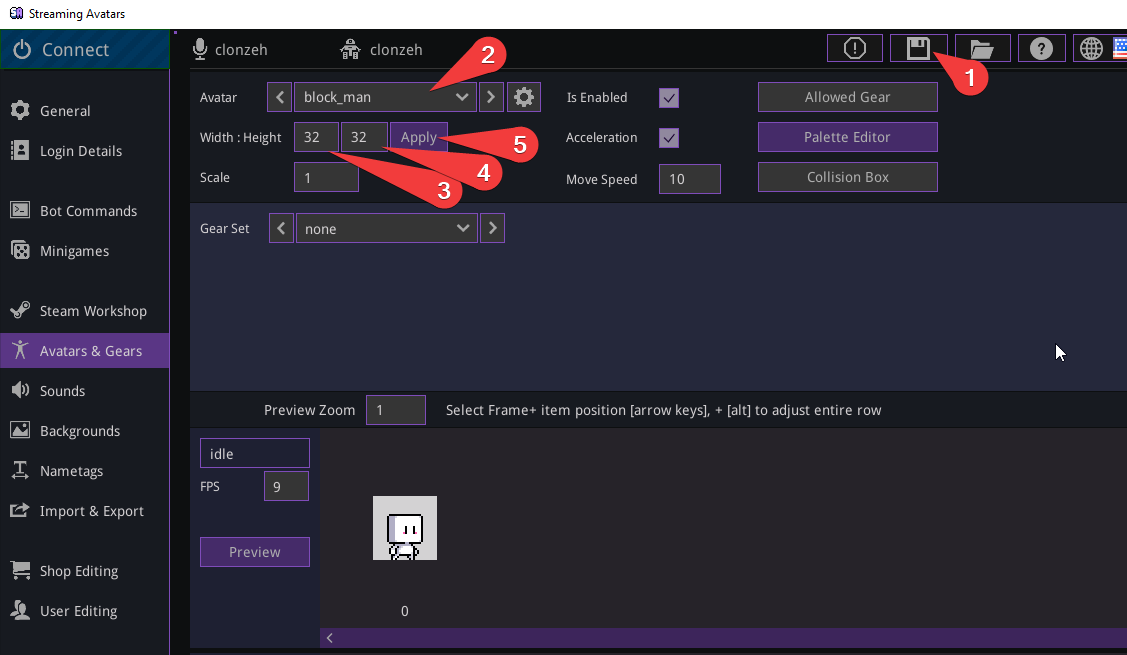 Set the width and height of your avatar. (single frame dimensions from the sprite-sheet)